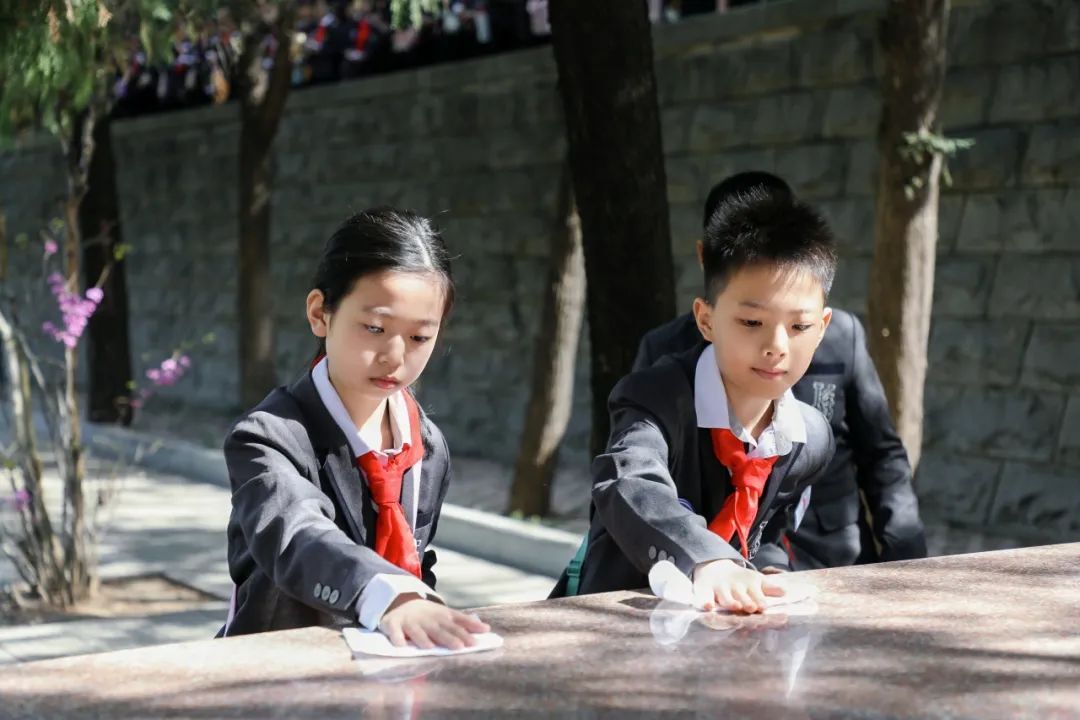 同学们徒步来到烈士陵园区域,怀着无比沉痛的心情,开展祭扫活动。各班级分组擦拭墓碑,献上鲜花,以质朴而真诚的方式,表达对革命先烈的无限哀思。