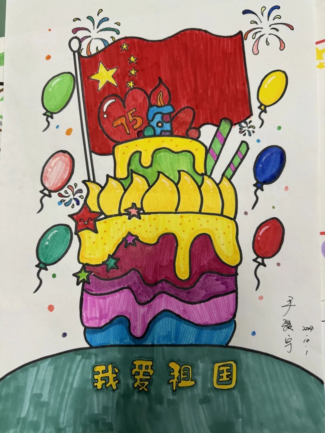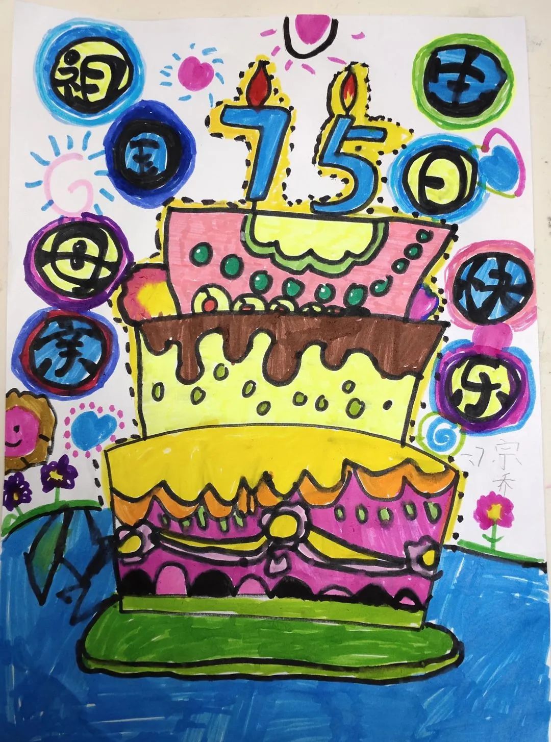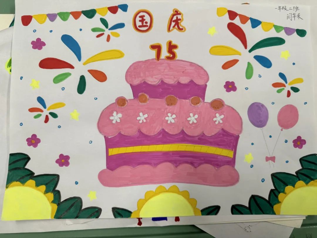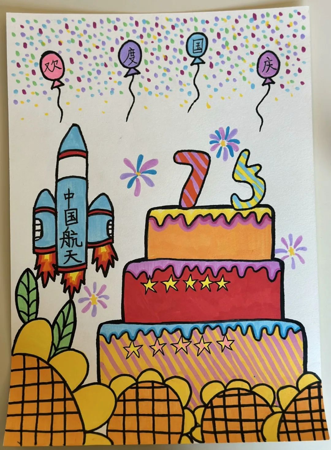 一二年级的小同学用画笔绘制一幅幅“创意蛋糕”,庆祝祖国妈妈的生日,为祖国送上祝福。