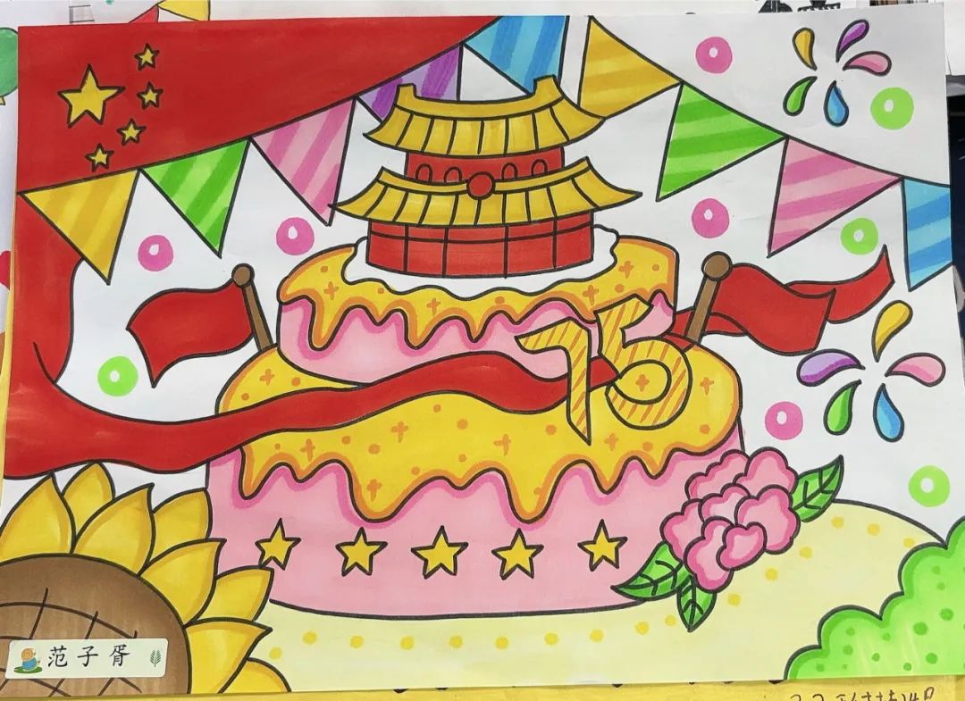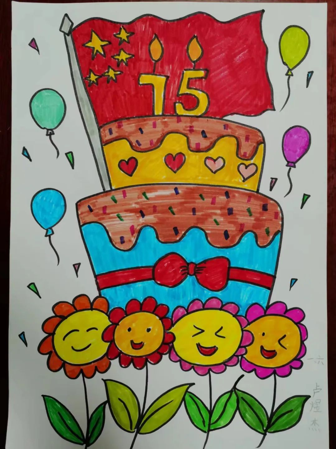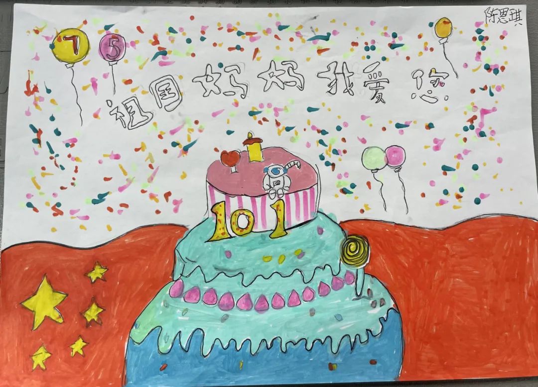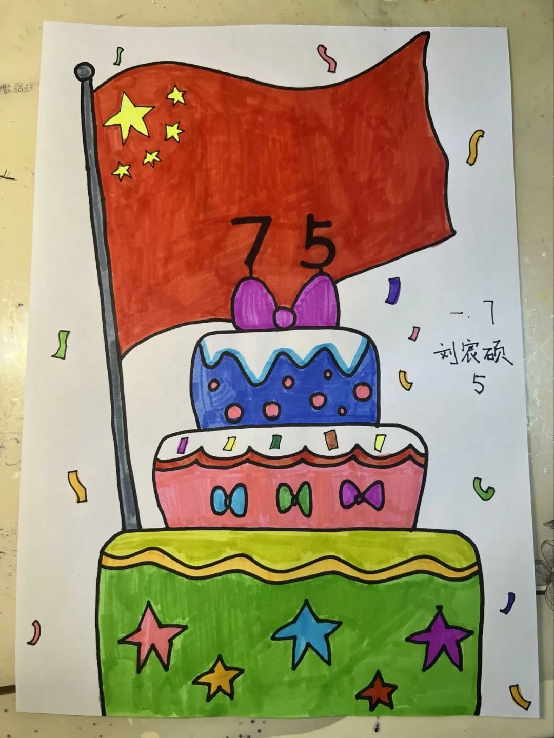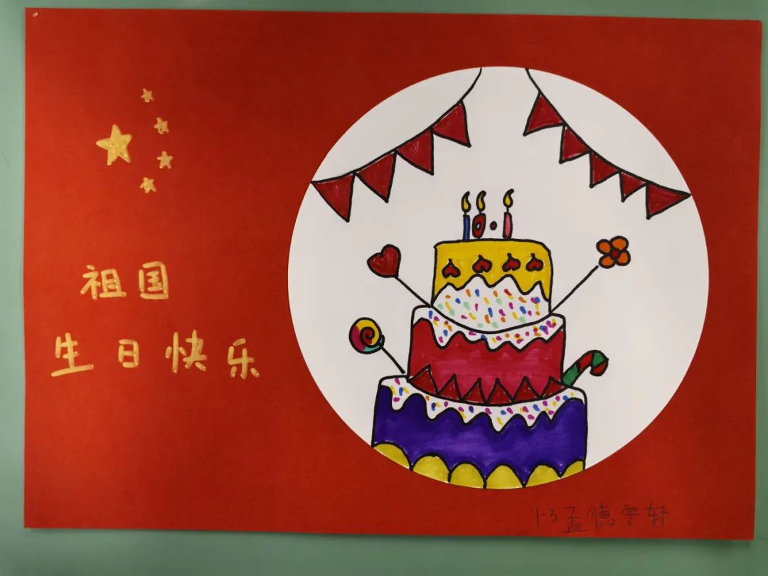 一二年级的小同学用画笔绘制一幅幅“创意蛋糕”,庆祝祖国妈妈的生日,为祖国送上祝福。
