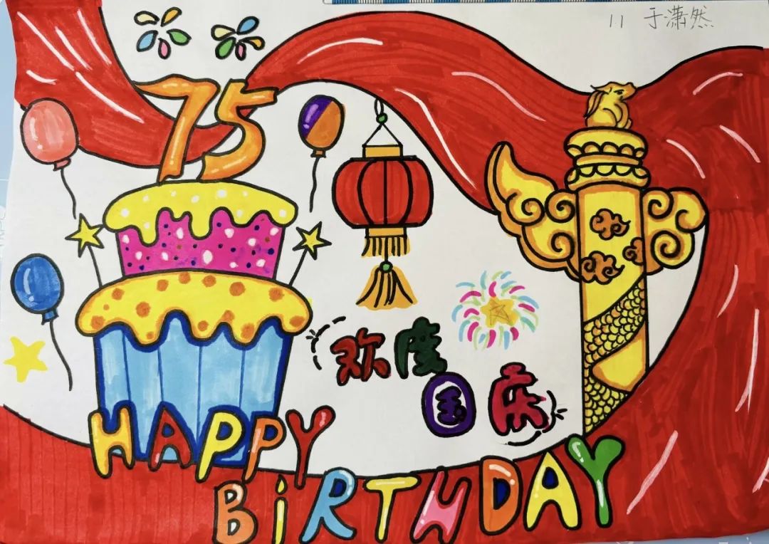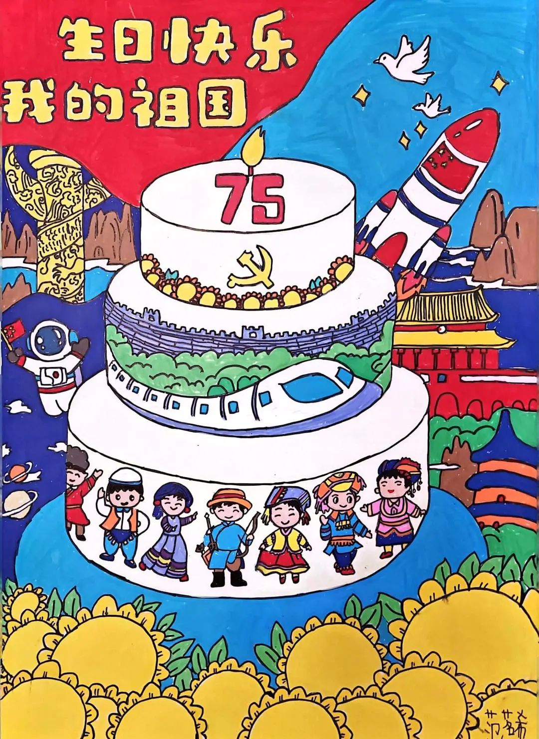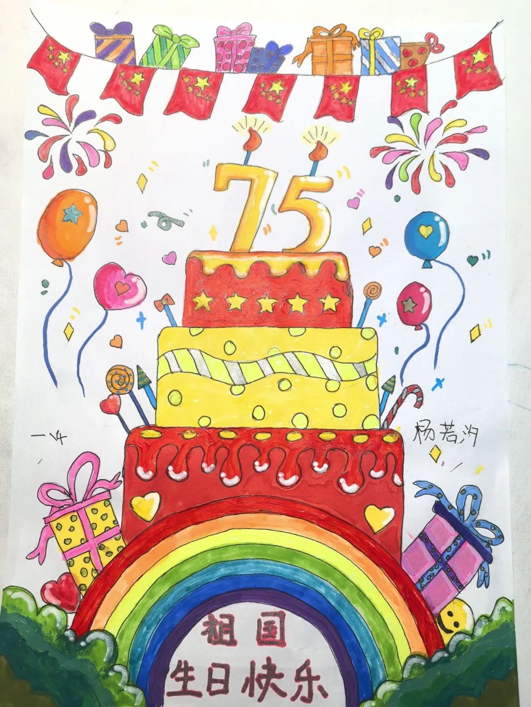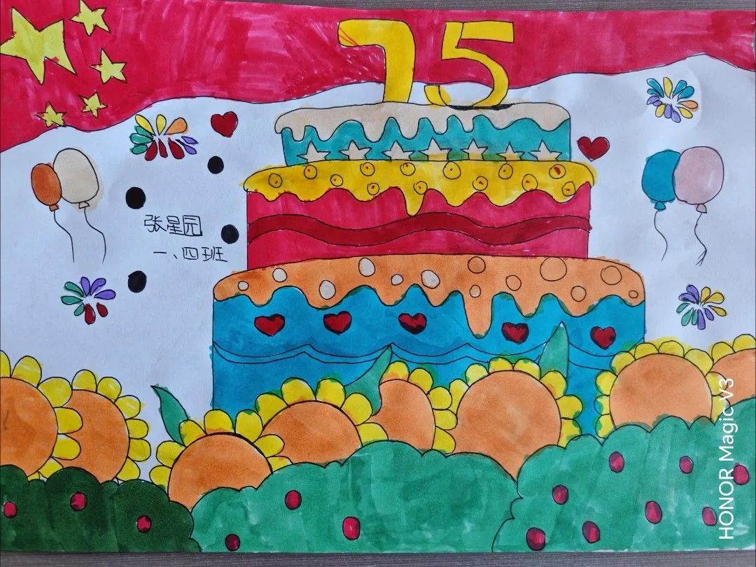 一二年级的小同学用画笔绘制一幅幅“创意蛋糕”,庆祝祖国妈妈的生日,为祖国送上祝福。