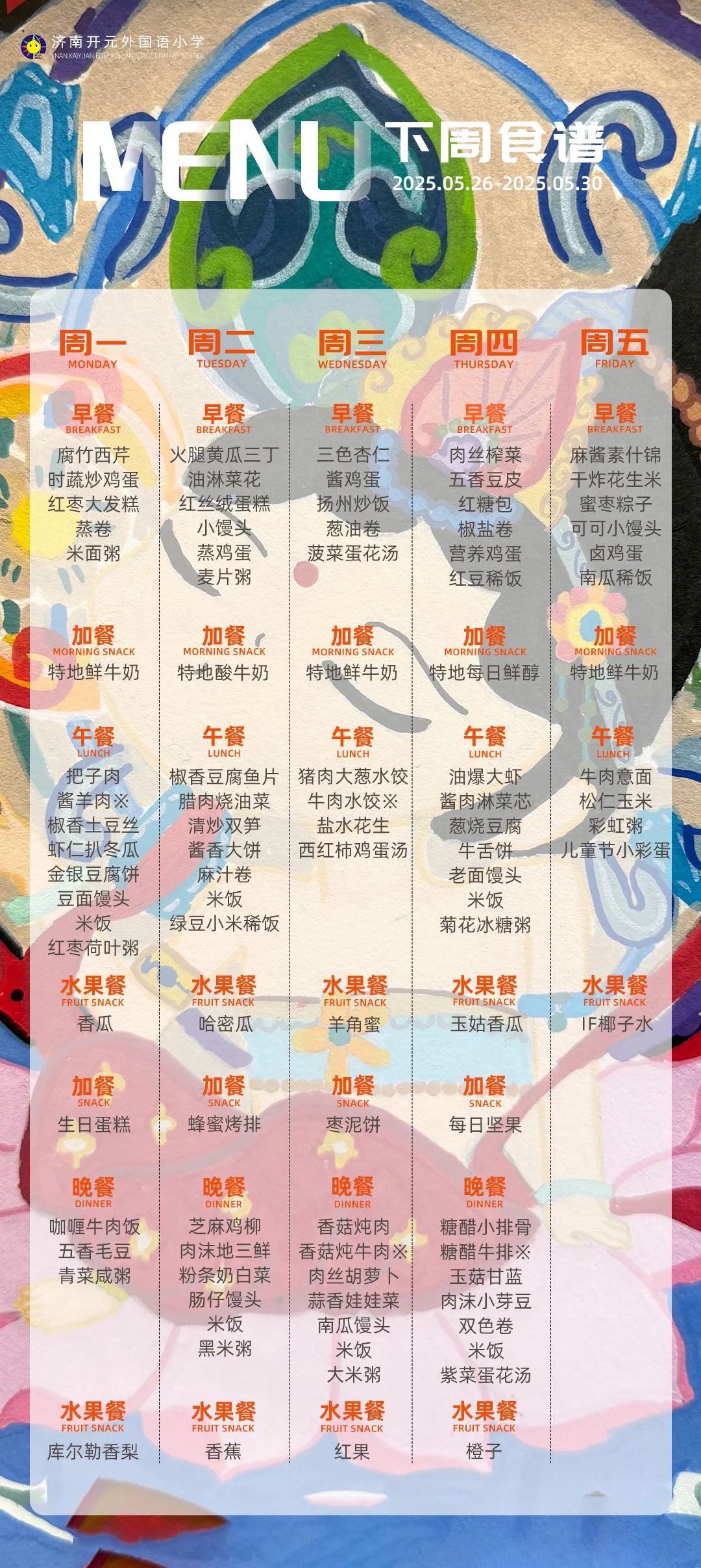 围绕端午节和六一儿童节,本周五还特别设计了惊喜菜单,等同学们来解锁呀!