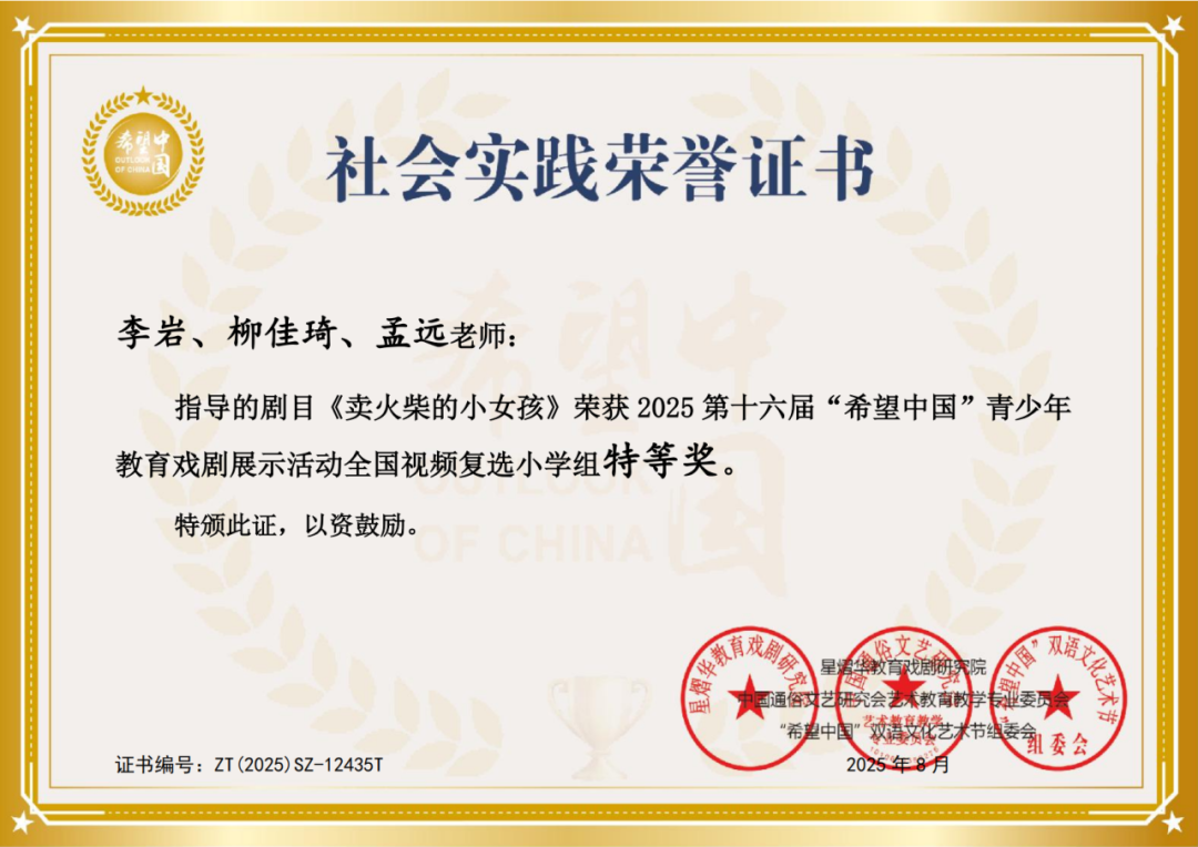 此次获奖,是学校继“希望中国”英语教育戏剧大赛全国一等奖后,在教育戏剧领域摘得的又一国家级殊荣。