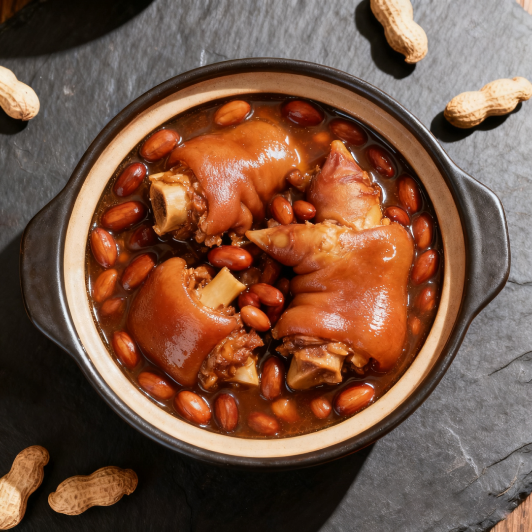 精选肥嫩猪手与饱满花生同煲。猪手经长时间炖煮,皮软肉糯,胶质满满;花生吸饱汤汁,粉糯香甜。二者完美融合,汤汁浓郁醇厚,富含营养,一口下去,幸福感在舌尖绽放。