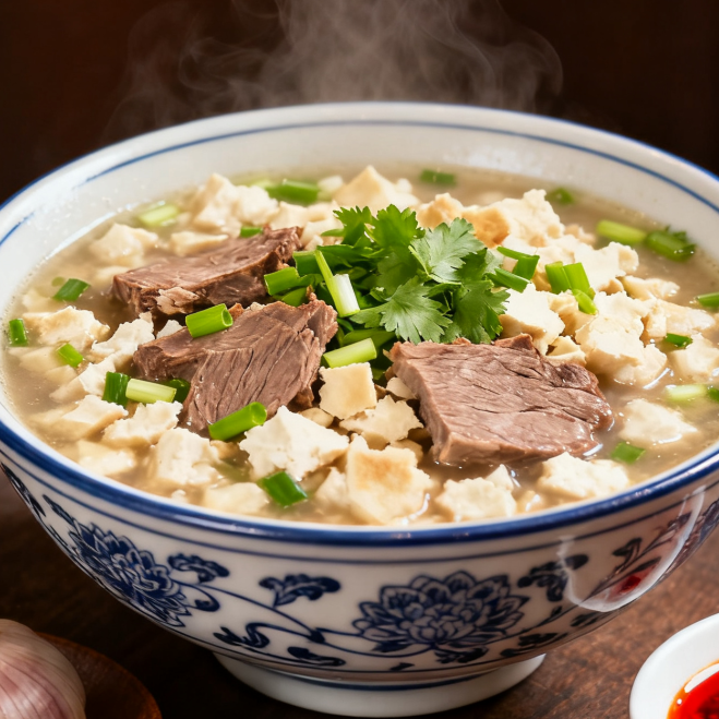 以鲜嫩羊肉炖煮入味,浓白汤底融合羊肉鲜香,馍吸饱汤汁后软糯有嚼劲,佐以粉丝、葱花、辣椒油,暖胃又滋补,是冬日里驱寒的绝佳选择,承载着西北饮食文化的独特魅力。