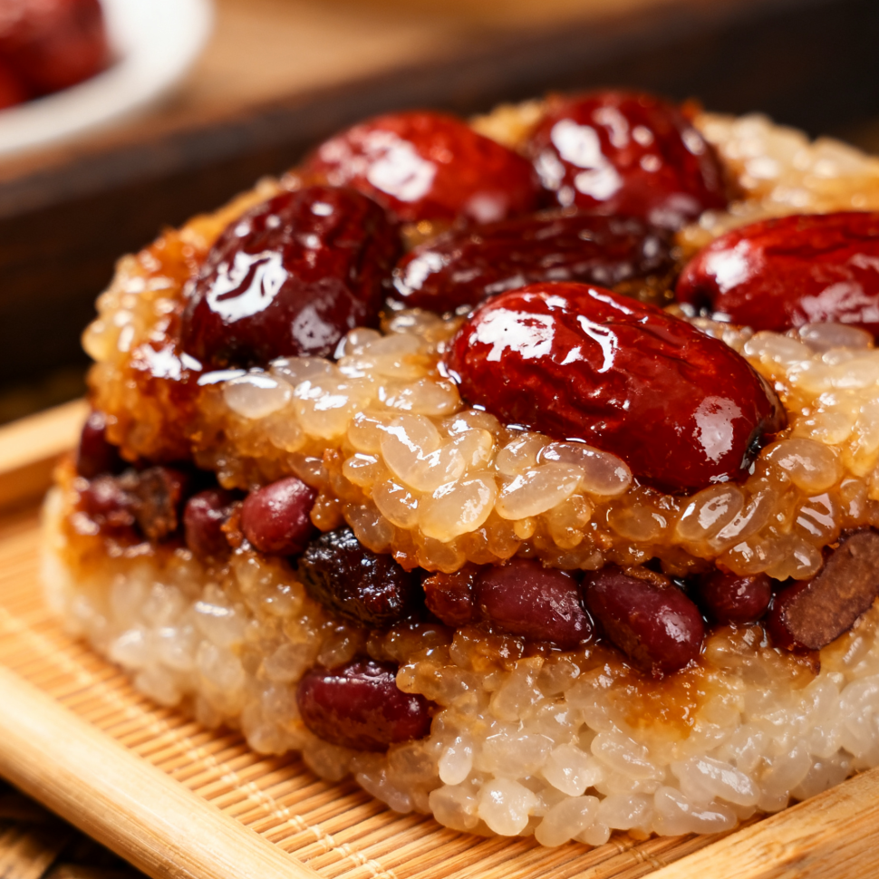 以糯米、红枣或蜜枣、红豆为原料,层层铺叠于铁甑中长时间蒸制而成。色泽鲜艳,枣香浓郁,糯米软糯黏香,红豆绵密沙甜,口感丰富,甜而不腻。