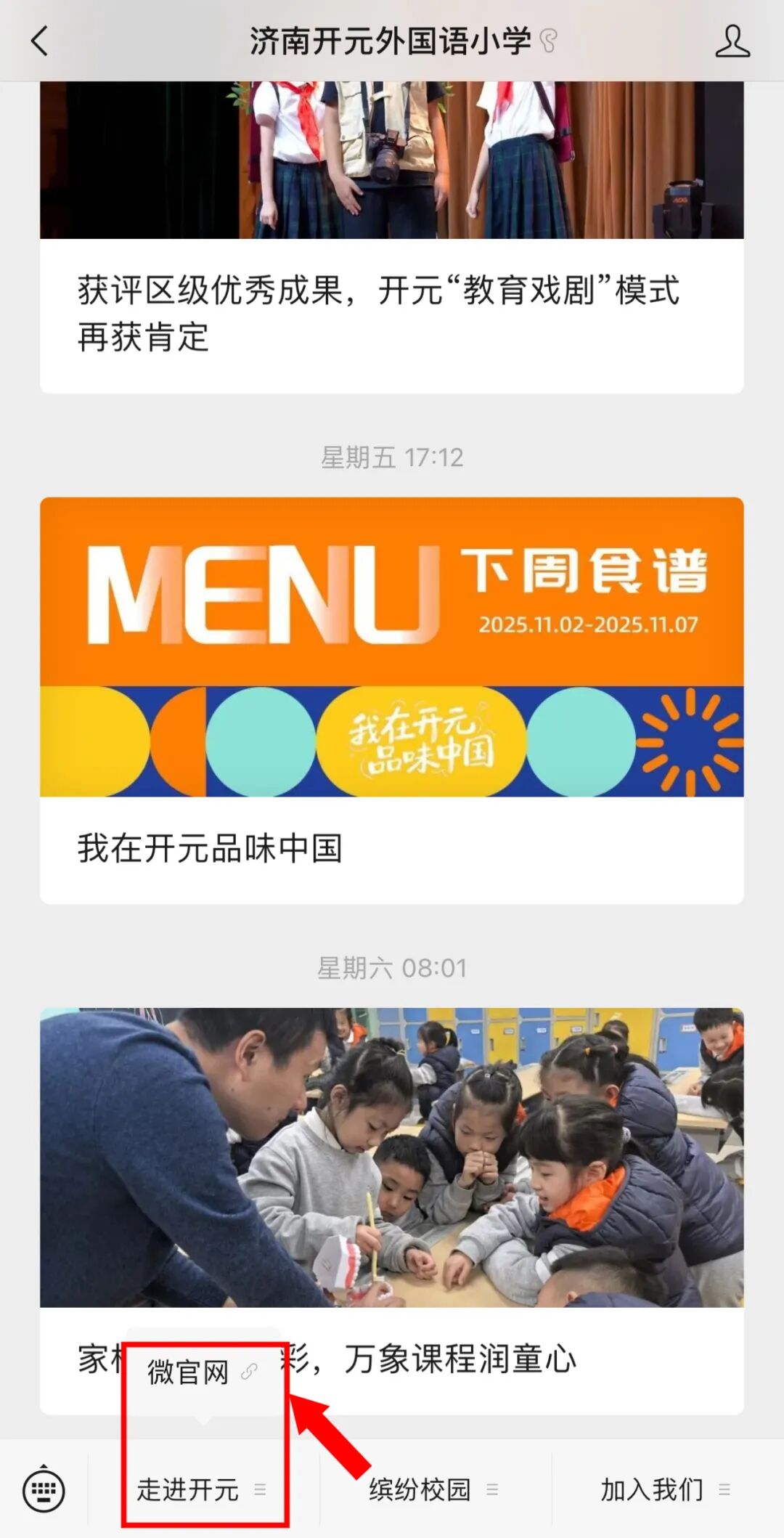 为方便随时浏览,我们同步开通了手机端入口。您可通过学校微信公众号,点击菜单栏“走进开元”,选择“微官网”即可一键进入。