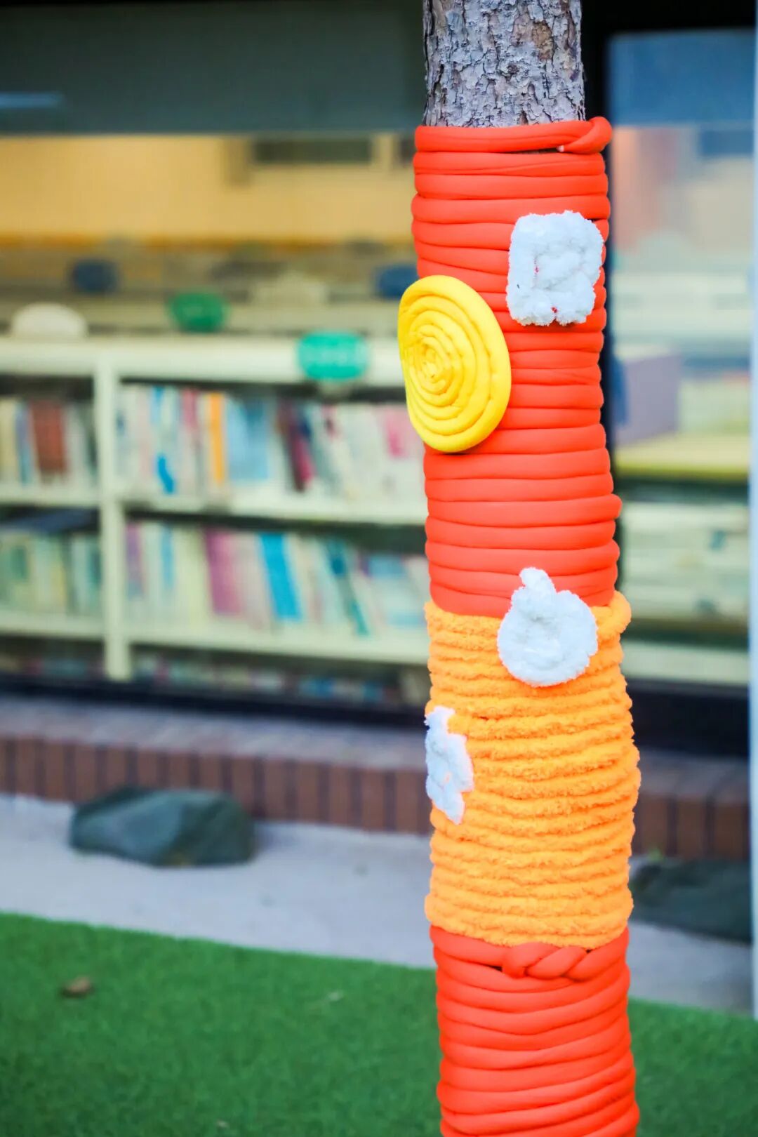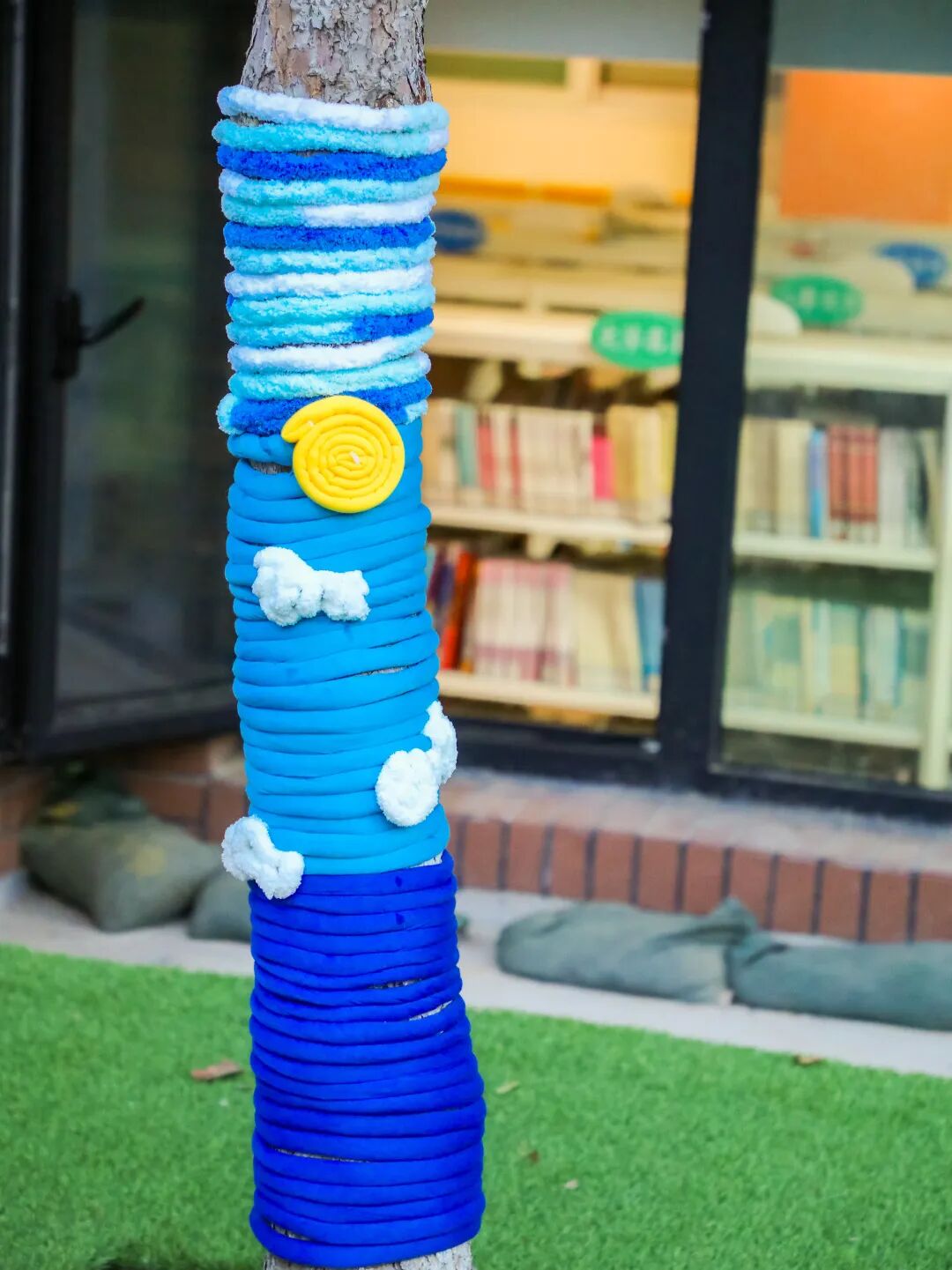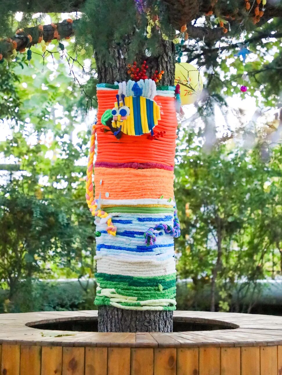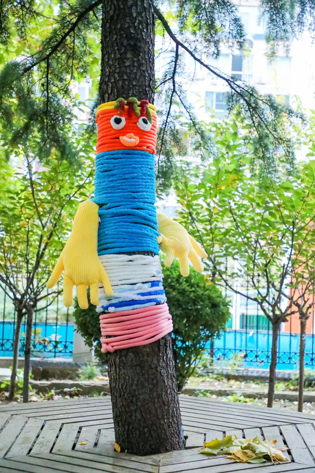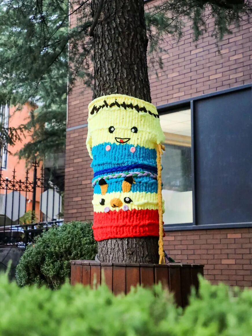 当一件件凝聚了创意与汗水的“毛衣”被精心穿上大树,校园瞬间被点亮了!明快的黄色像太阳,活泼的橙色像橘子,温柔的蓝色像天空……五彩斑斓的“多巴胺”色彩,让每一棵树都成为快乐的发光体。