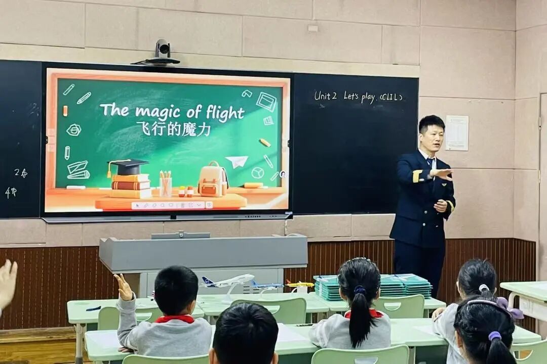 本次家长进课堂活动以“飞行的魔力”为主题,邀请中国东方航空公司山东分公司飞行教员师筠然的爸爸师国鹏走进课堂,为孩子们带来了一场妙趣横生的航空知识盛宴,达到了启蒙科学认知、播种蓝天梦想的预期目的。