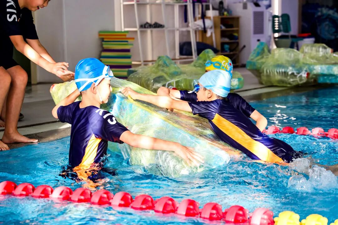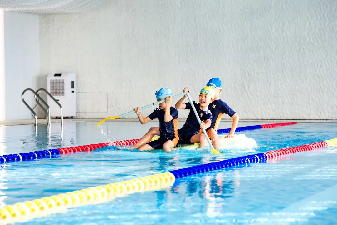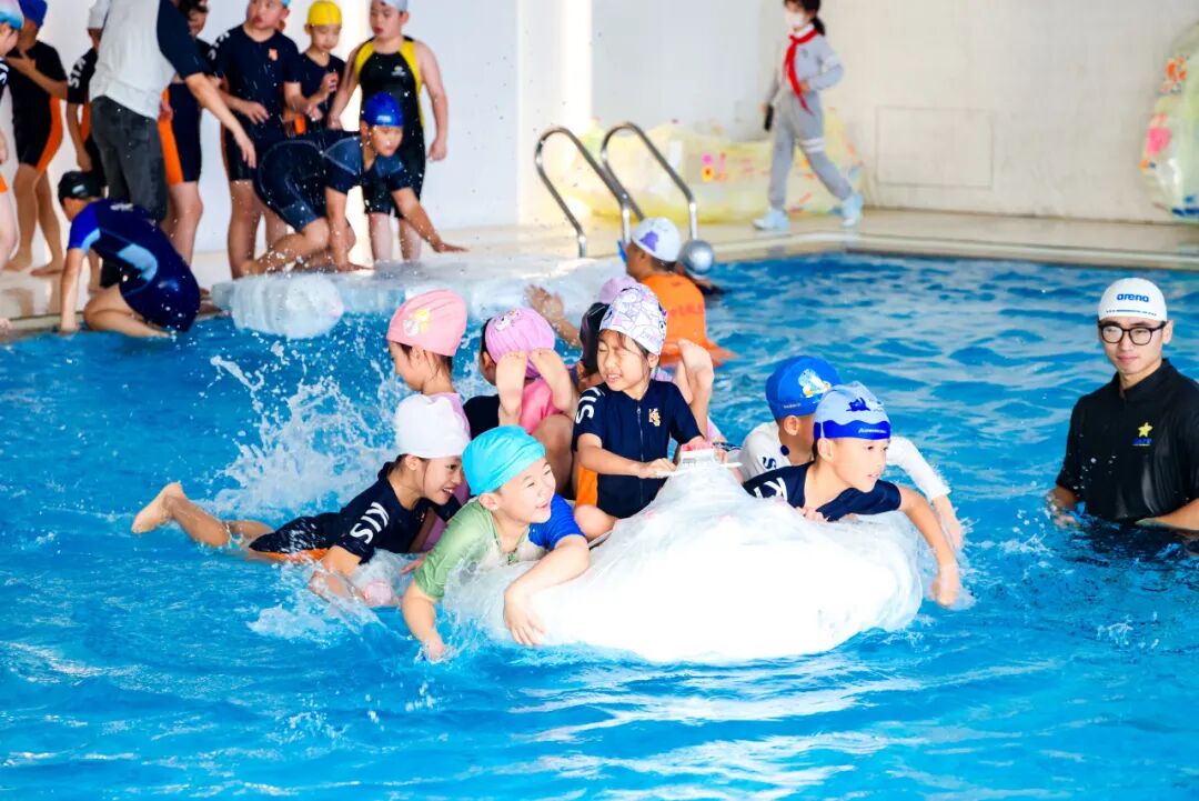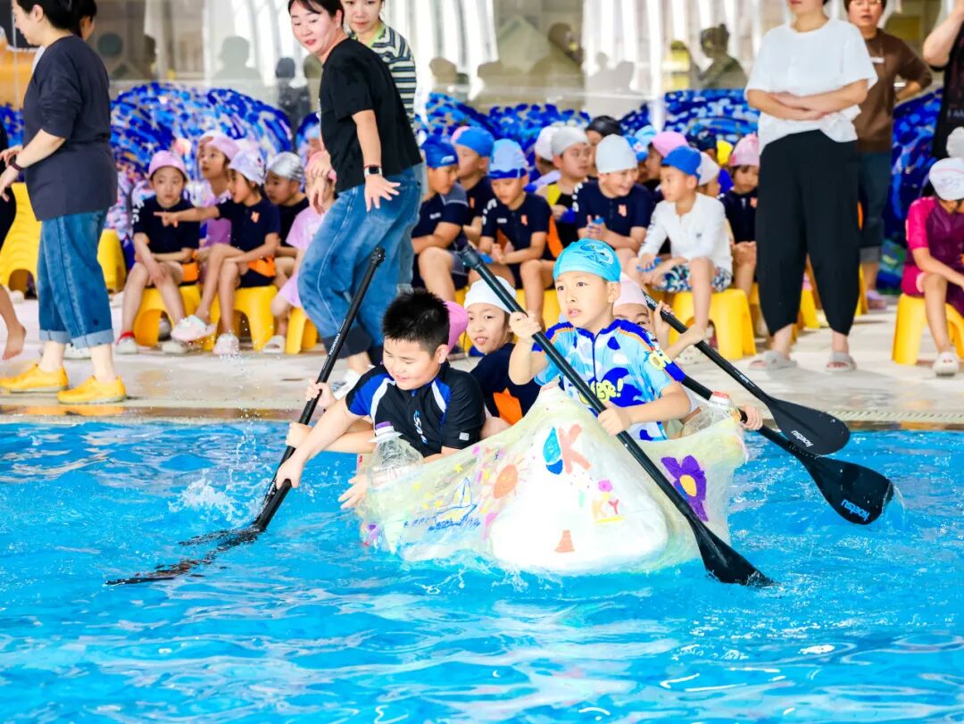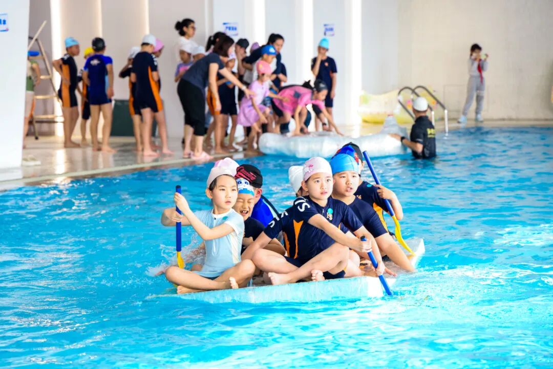 最令人期待的出项环节,成了孩子们展示成果的 “高光舞台”。游泳馆内,“船王争霸赛” 火热开赛:各班的小船依次 “出征”,在赛道上破浪前行,目标是在 25 分钟内运送更多同学到对岸。正副班主任和船长老师忙着帮学生稳稳登船,安全员全程守护在旁,每当有小船顺利抵达对岸,岸边就响起一阵欢呼;黑板上的数据不断上升,那是各班努力的见证。