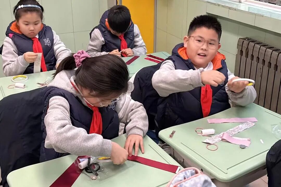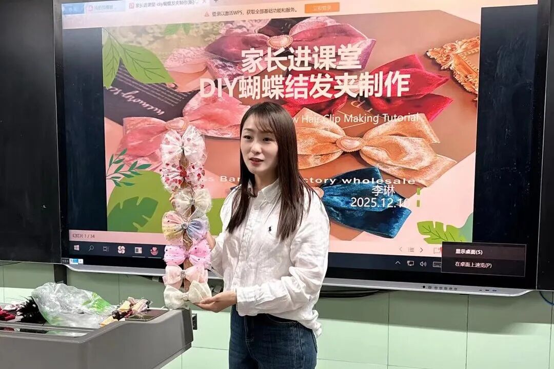 活动一开始,李琳女士就用生动的分享点燃全场,各色精致手工作品的展示,瞬间勾起了孩子们的创作热情。随后,她一步步细致演示蝴蝶结发卡的制作流程,从剪裁到拼接,每个技巧都讲解得清晰易懂。孩子们分组协作、互帮互助,在李琳女士和老师的巡回指导下,发挥奇思妙想。