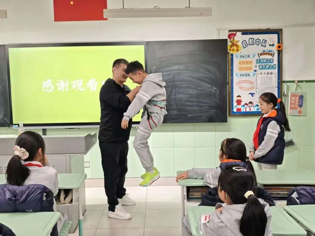 直观展示 + 趣味讲解,瞬间让孩子们对这项运动充满好奇。“岩壁模仿秀”“身体拼字母”等互动游戏轮番上线,课堂气氛直接拉满!孩子们在欢声笑语中亲身实践,牢牢记住了“手脚并用、安全第一”的攀岩核心原则。