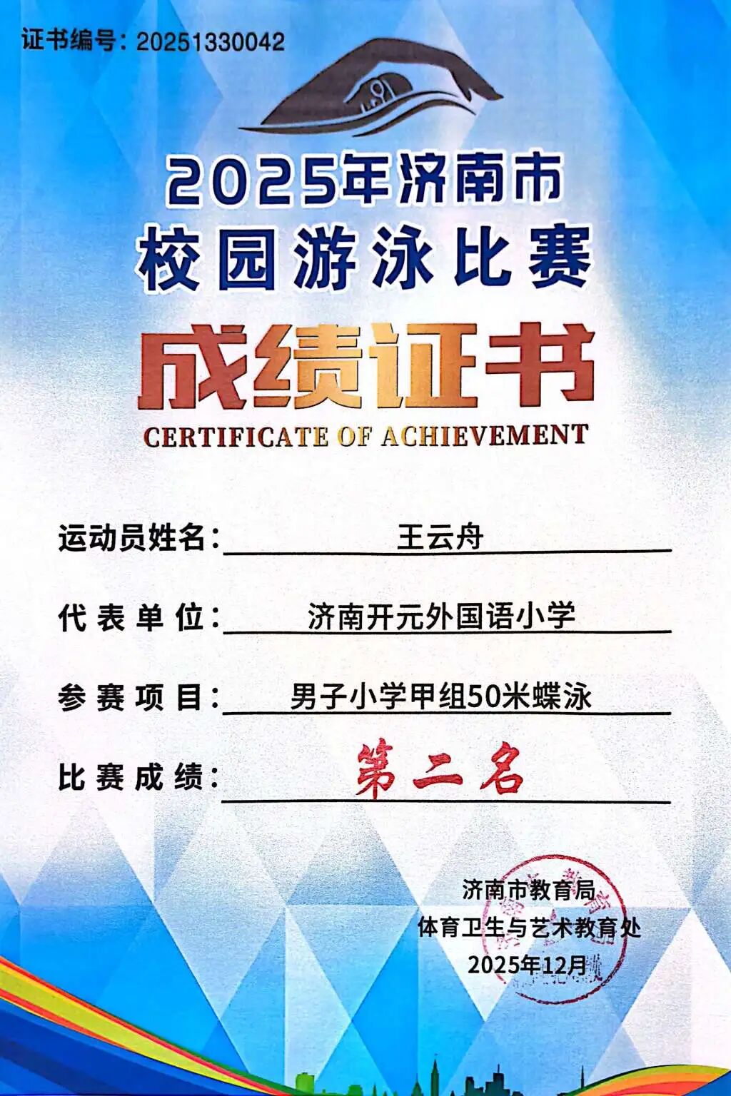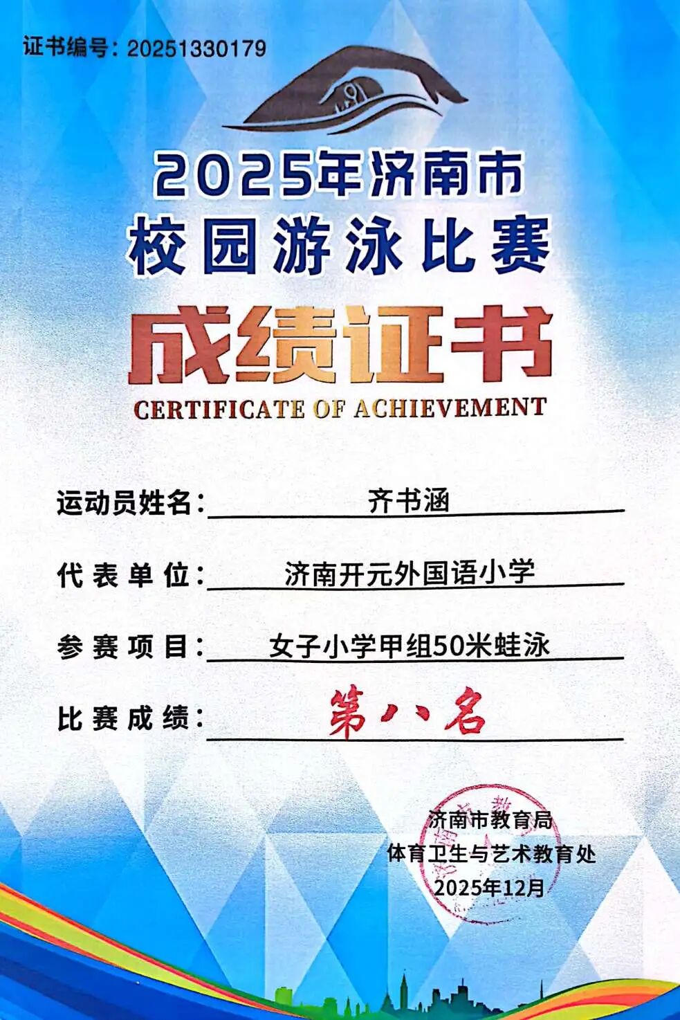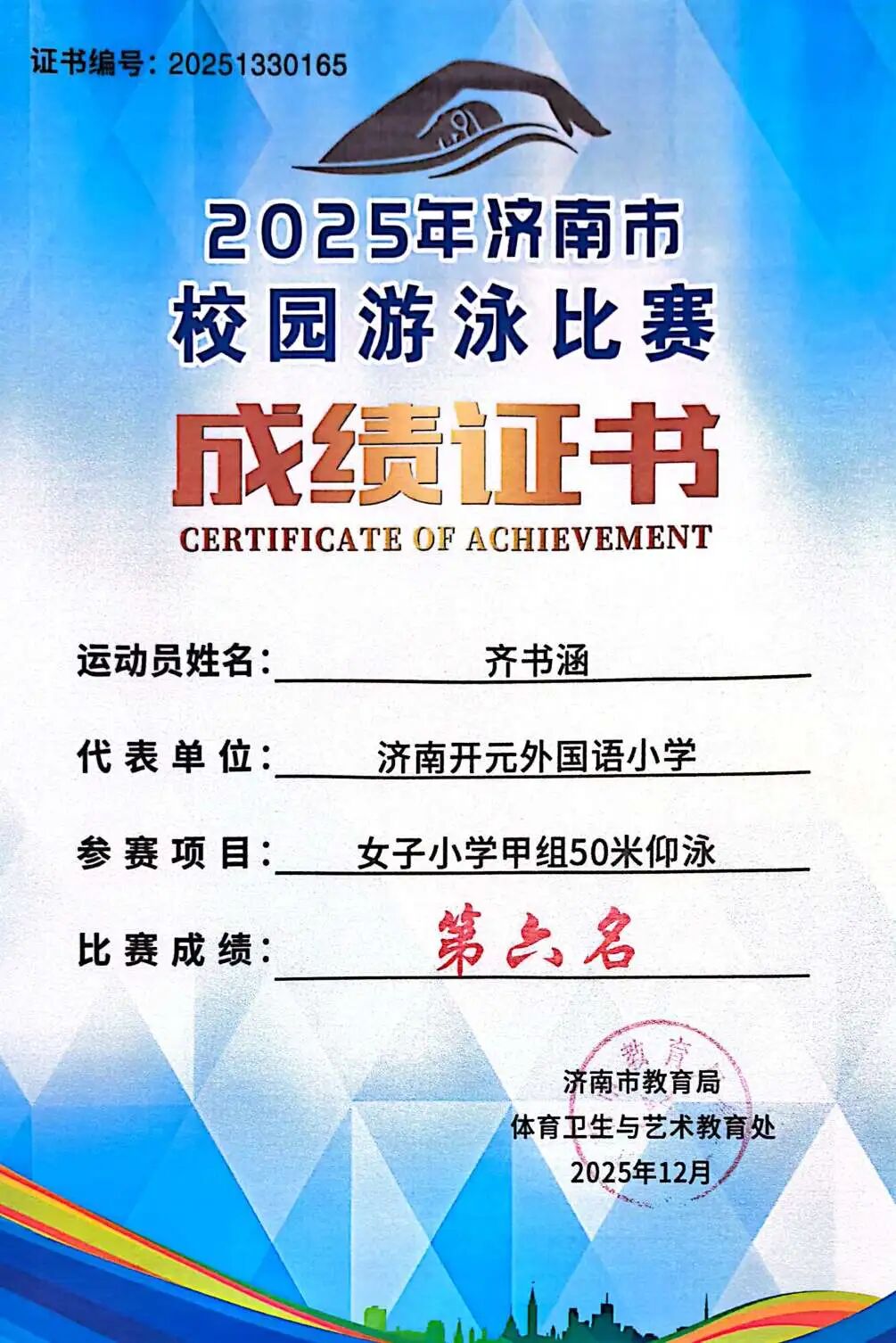 10月26日,济南市校园游泳比赛圆满落幕。我校游泳队奋勇拼搏,实现历史性突破:从以往无缘前八,到本届一举将亚军、季军、第六名、第八名等多个重要奖项揽入怀中,团队整体实力跃上新台阶。