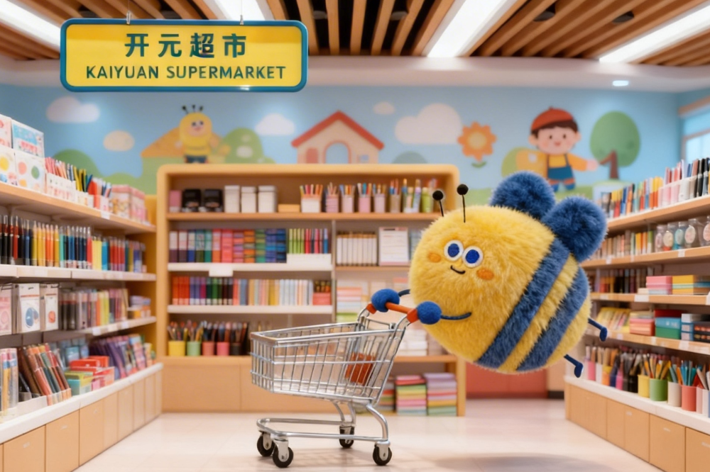 每周固定时间,小蜜蜂超市准时开门“营业”。柜台上琳琅满目的,可不是普通文具——全都是基于学校全新吉祥物“开开”和“元元”开发的文创用品:从萌萌的吉祥物徽章到各类中性笔、尺子、笔记本,再到包挂件、钥匙扣、冰箱贴……每一件都想带回家!