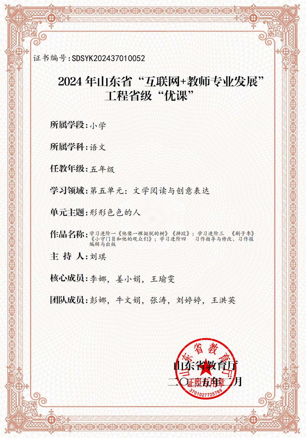 近日,山东省教育厅公布2024年度“互联网+教师专业发展”工程省级优课评选结果,开元外国语小学五年级语文组联合打造的部编版五年级下册第五单元《跟着作家学写人》单元整体教学设计,经过市级遴选、省级评审等层层选拔,最终从全省参评课例中脱颖而出,荣获省级优课殊荣。这也是“一师一优课”首次以团队的形式进行评选,我校开创性地获此殊荣,标志着学校课堂教学改革取得突破性进展。