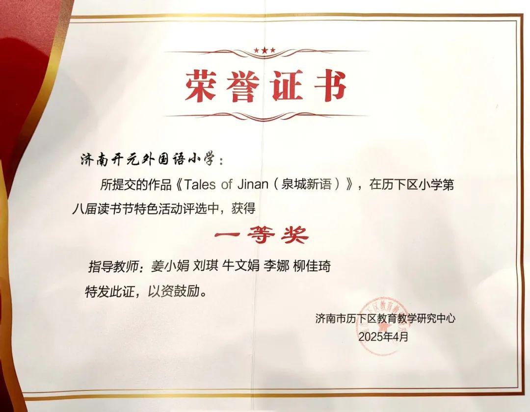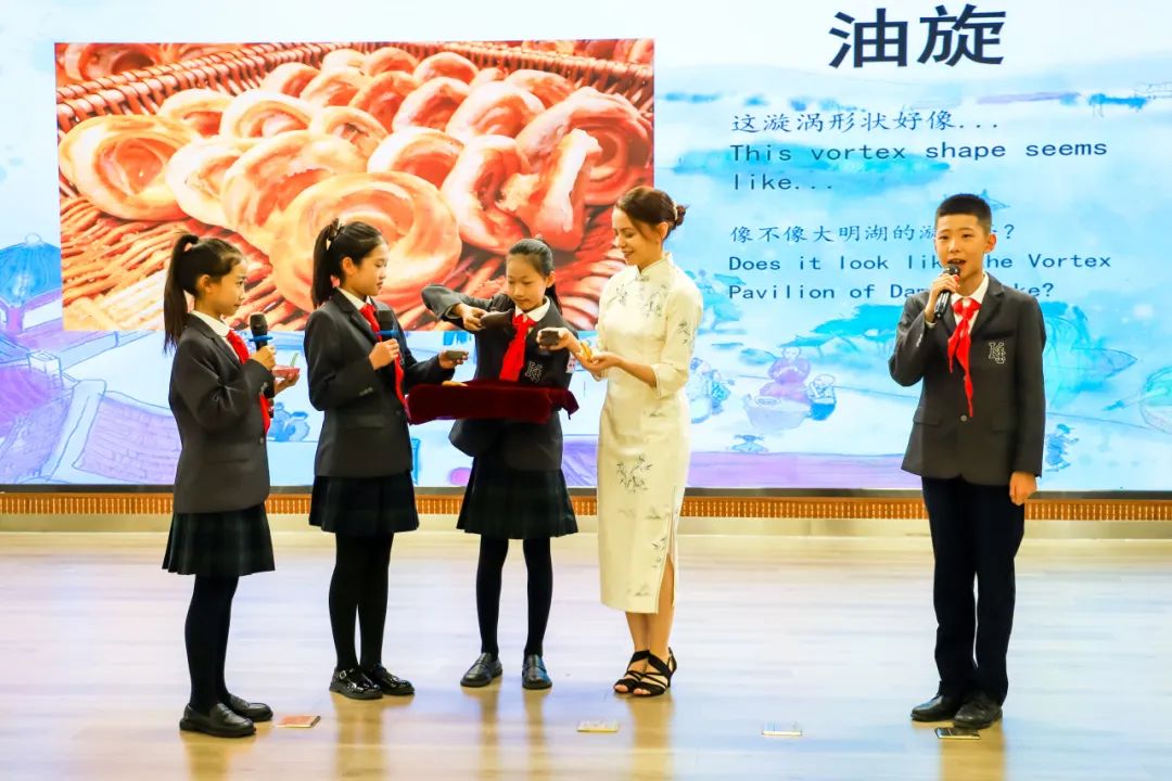 校外多元传扬,学校积极参与历下区读书节活动,我校提交的两个阅读作品在展评活动中分别获得一二等奖。现场展演活动中,五年级的学生与外教老师Yana双语演绎《泉城心语》,学生作为小导游,热情地向她介绍了《老残游记》中刘鹗笔下的济南。油旋,碧筒饮,听梨花大鼓,盘扣艺术。济南人的生活,感动了Yana,更感动了在场的每一个人。