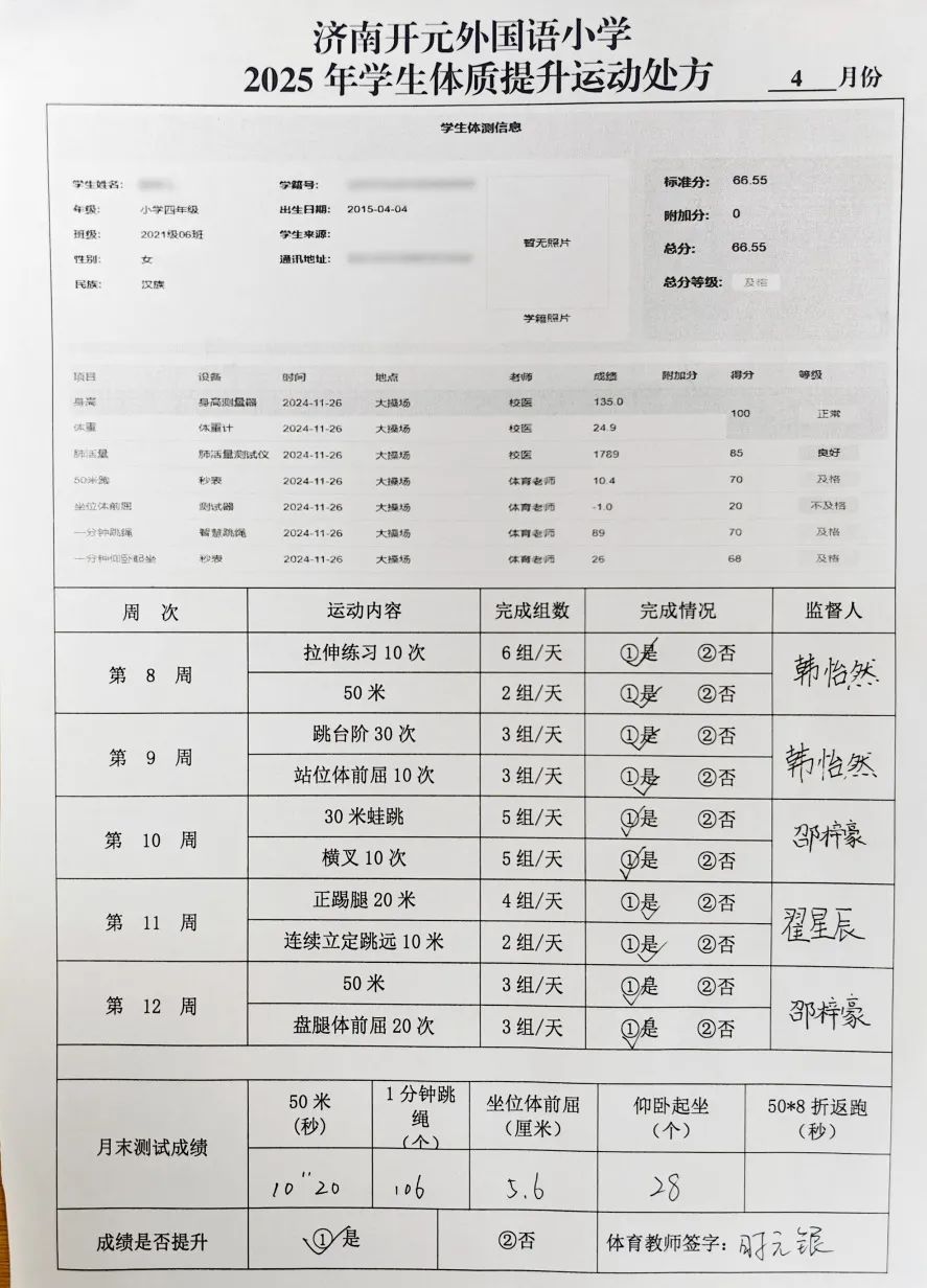 以体测为镜,照见成长;以数据为尺,丈量未来。济南开元外国语小学通过这场全员参与的体质健康“大考”,不仅检验了日常体育工作的成效,更激发了学生的运动热情。未来,学校将继续深化家校社协同机制,让健康习惯从校园延伸到家庭,为学生的终身发展筑牢基石!