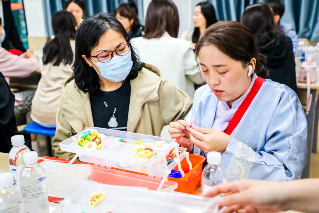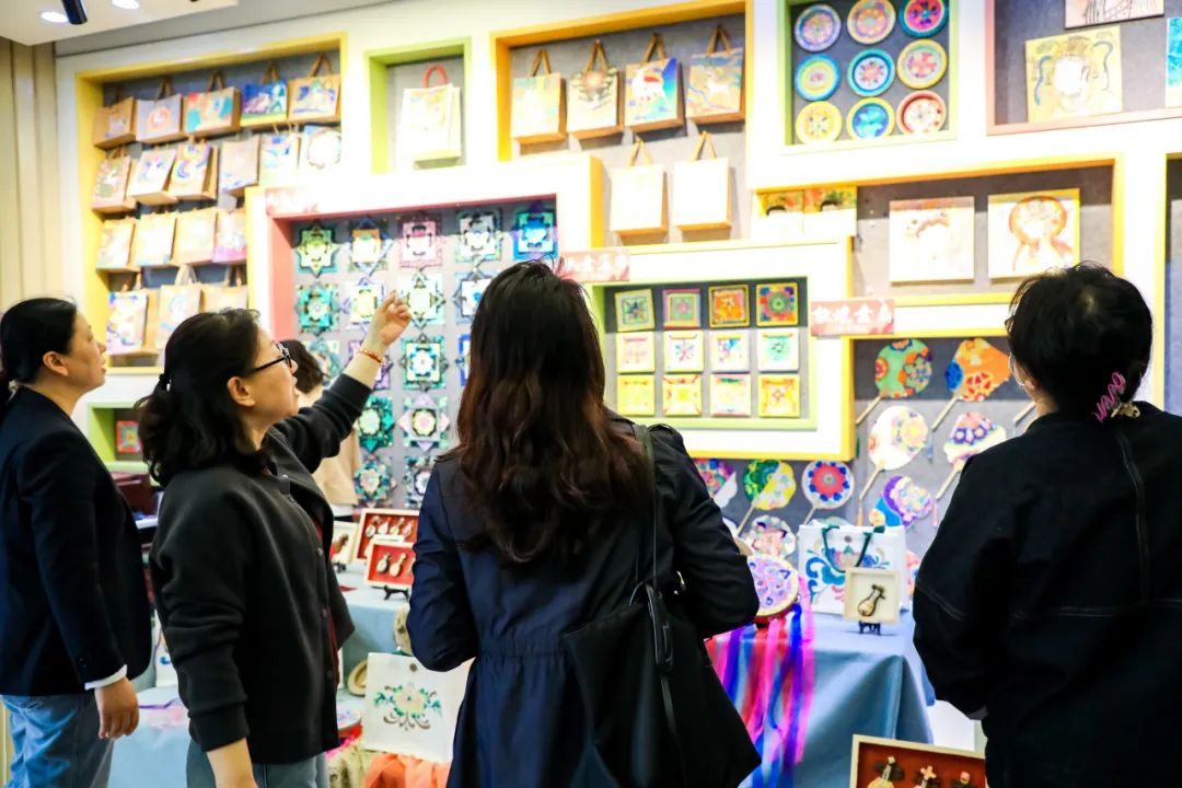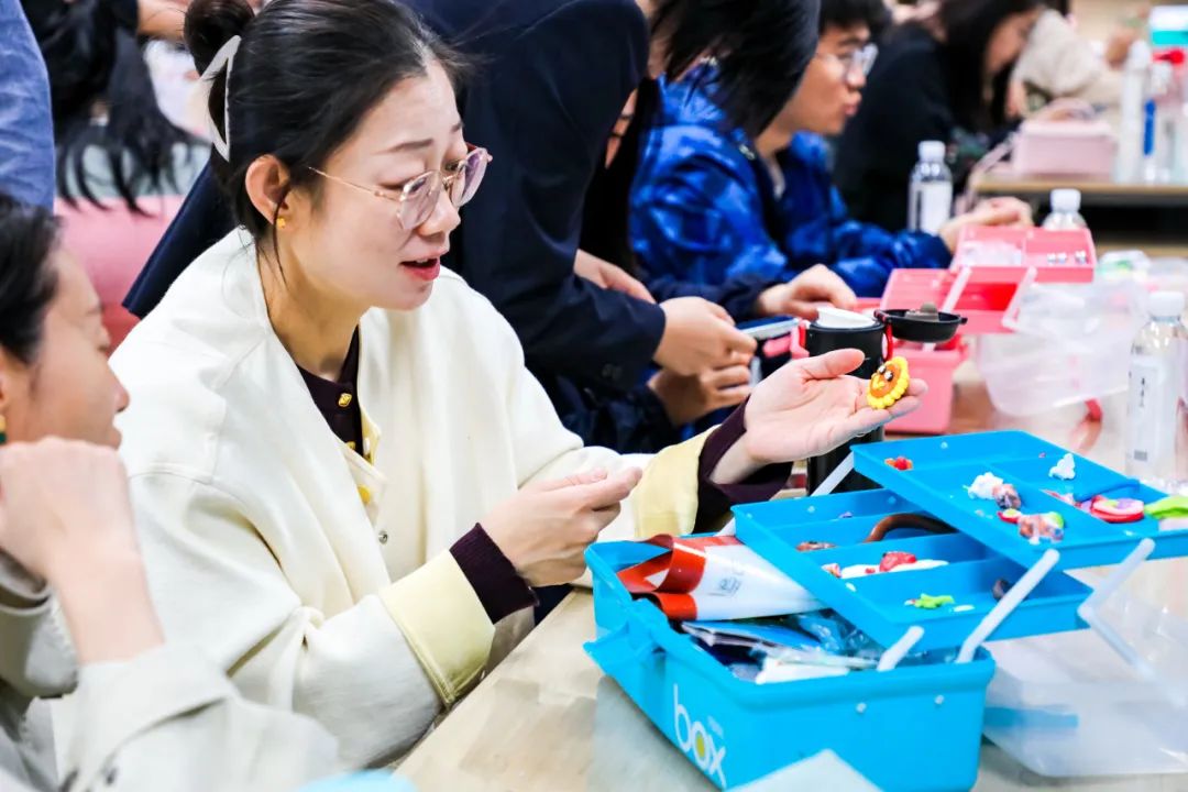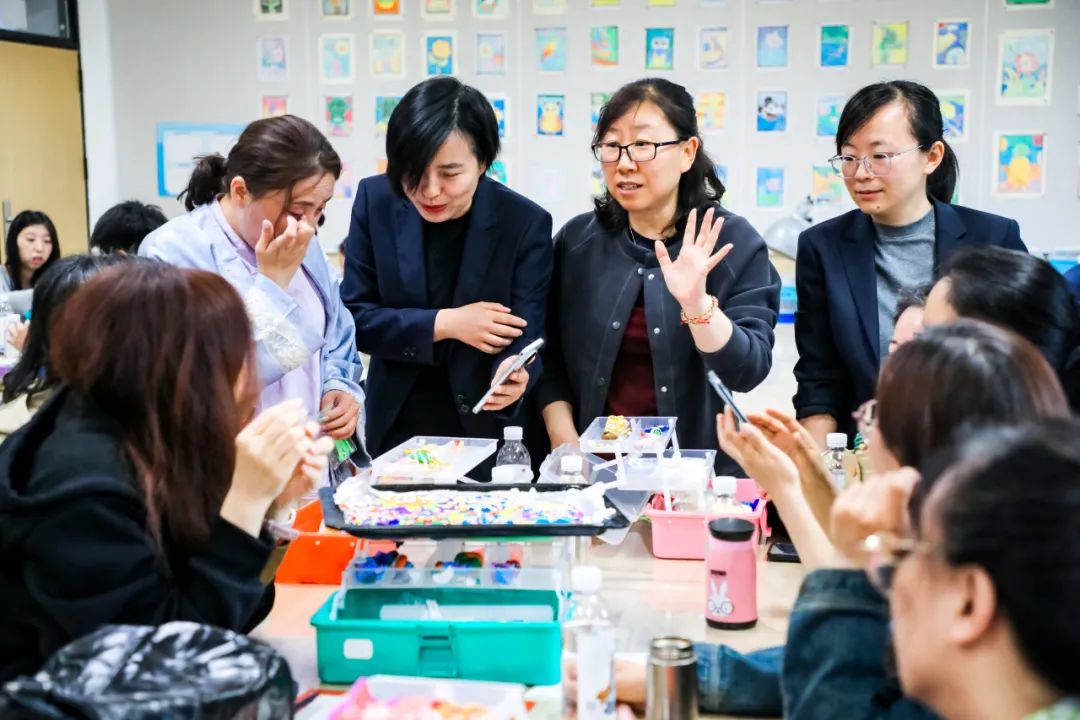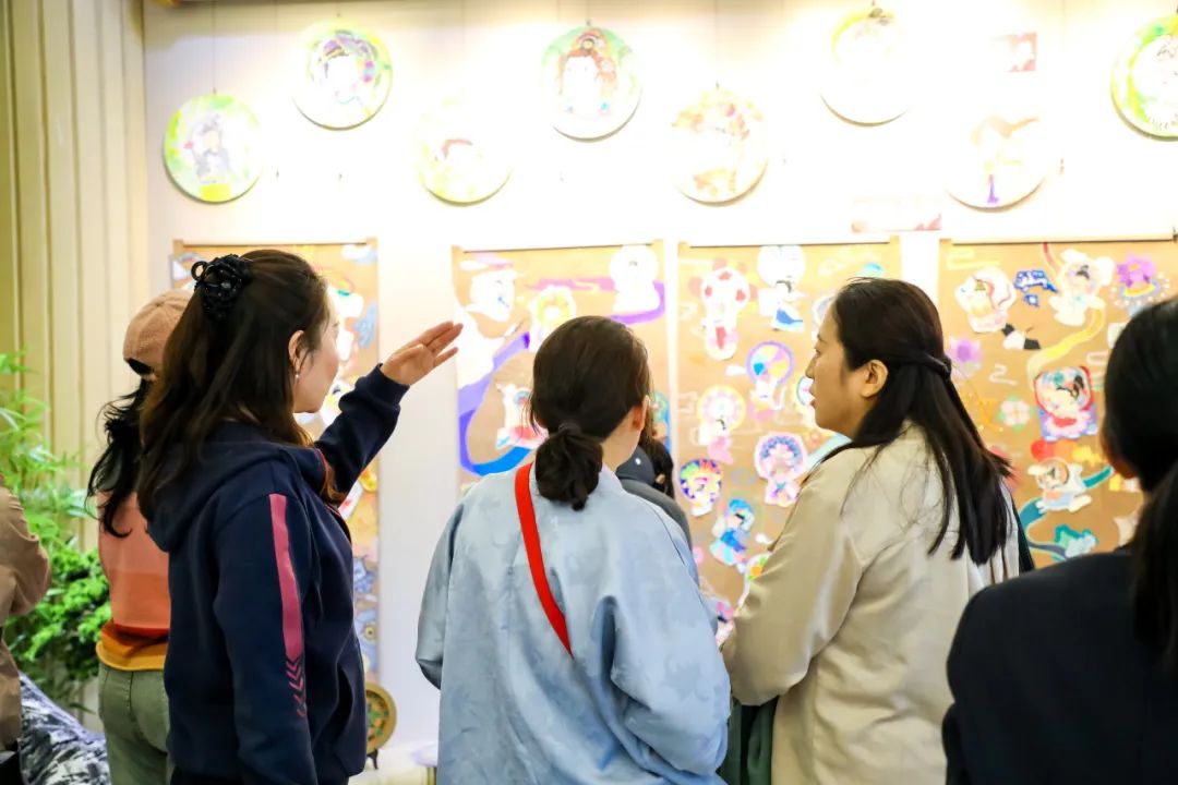 随后,老师们移步至软陶创作体验区。在这里,老师们亲身体验了我校艺术特色课程的软陶材料。最后,老师们来到学生作品展区。孩子们用稚嫩却充满灵性的笔触,重新演绎飞天的飘逸、藻井的华美。一幅幅作品中,传统元素与现代创意碰撞出绚丽火花,展现出对敦煌艺术天马行空的独特理解。