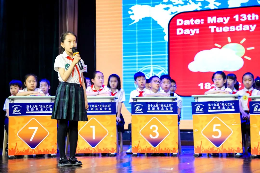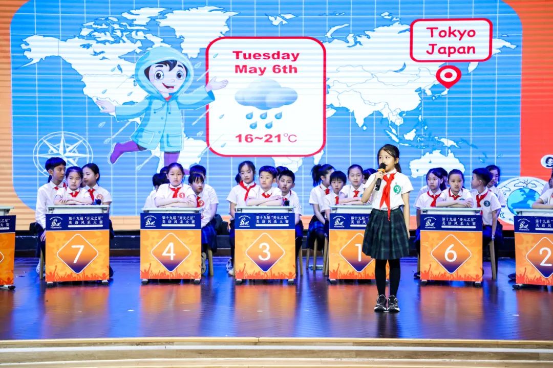 中段实践应用场(3-4年级):“环球识华夏” 环节,学生用英文讲述传统文化故事,以流畅表达彰显语言功底与文化自信。“环球气象站” 环节,选手化身气象主播,随机选取九座城市天气数据,融合地理知识,用英文专业播报,展现英语应用与跨学科知识储备。
