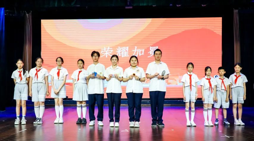 五年级学生代表为毕业生佩戴上亲手制作的“母校荣耀勋章”。这枚承载着敬佩与祝福的勋章,将母校与学子的心紧紧相连。