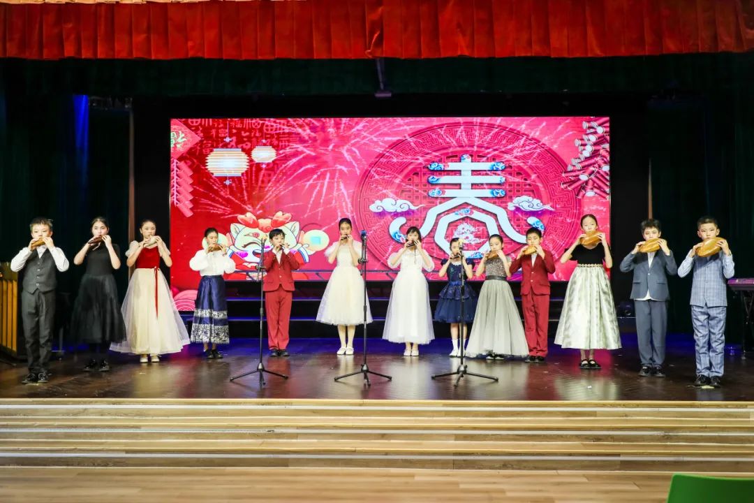 20名小演奏家身着开元校服,手持陶笛整齐登场,一曲清新灵动的重奏《散步》瞬间将观众带入静谧美好的音乐世界。空灵婉转的音色如溪流潺潺,高低声部交织如枝叶摩挲,孩子们专注的神情与默契的配合,完美诠释了陶笛音乐的细腻与感染力。