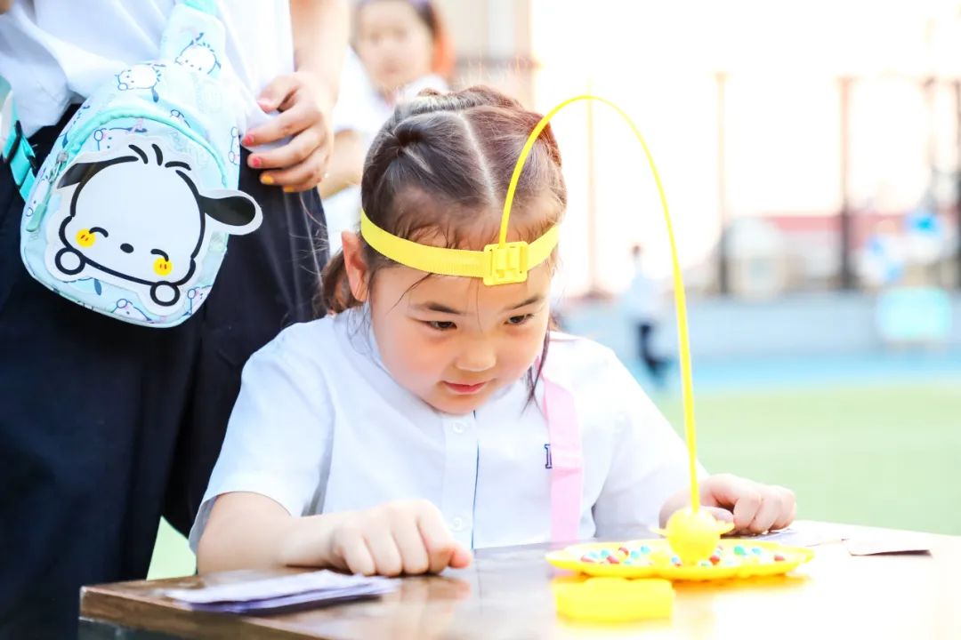 “蜜蜂采豆”的桌子旁,戴着吸铁石钓竿的小脑袋凑成一圈,钓竿落下时小球 “叮” 地被吸起,成功攒够 10 颗的孩子举着奖品蹦得比桌子还高。