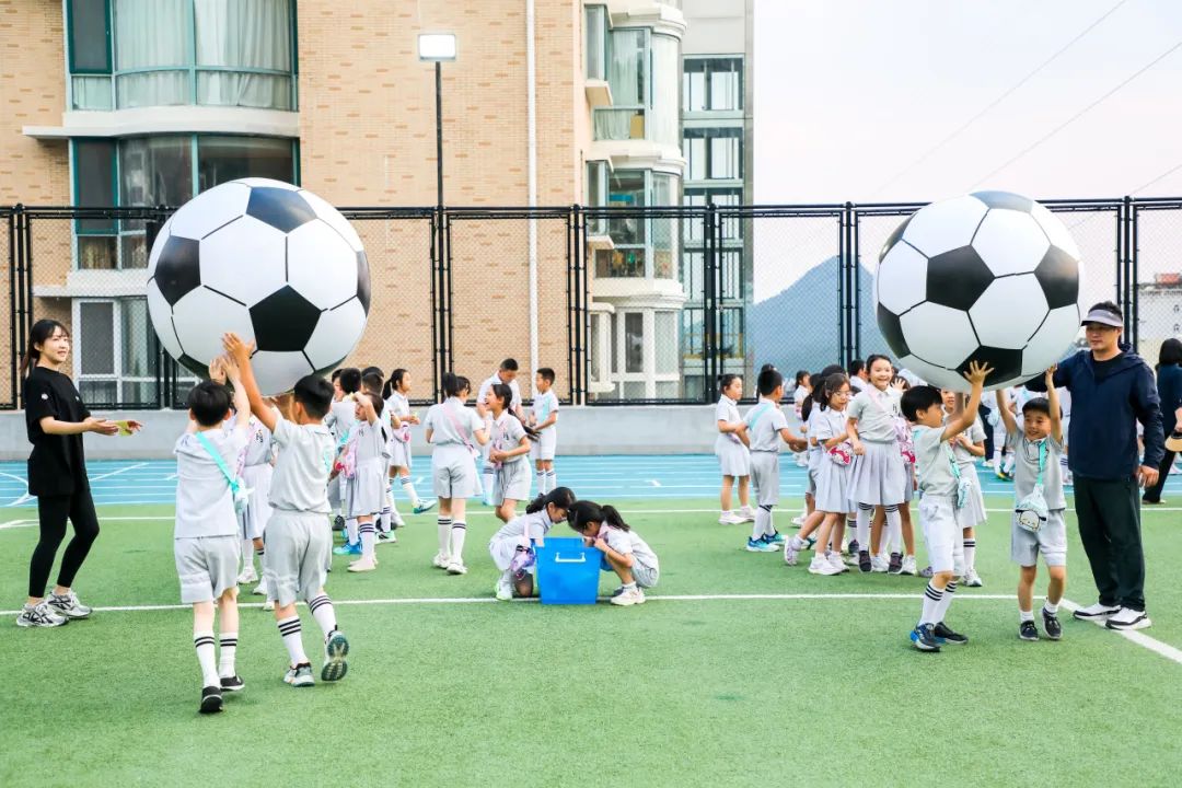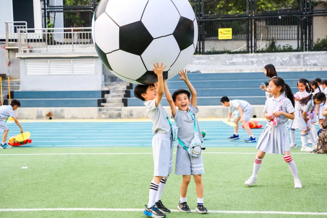 “合力运球”考验着搭档默契,两个孩子伸开手臂护着大球,摇摇晃晃闯过障碍。