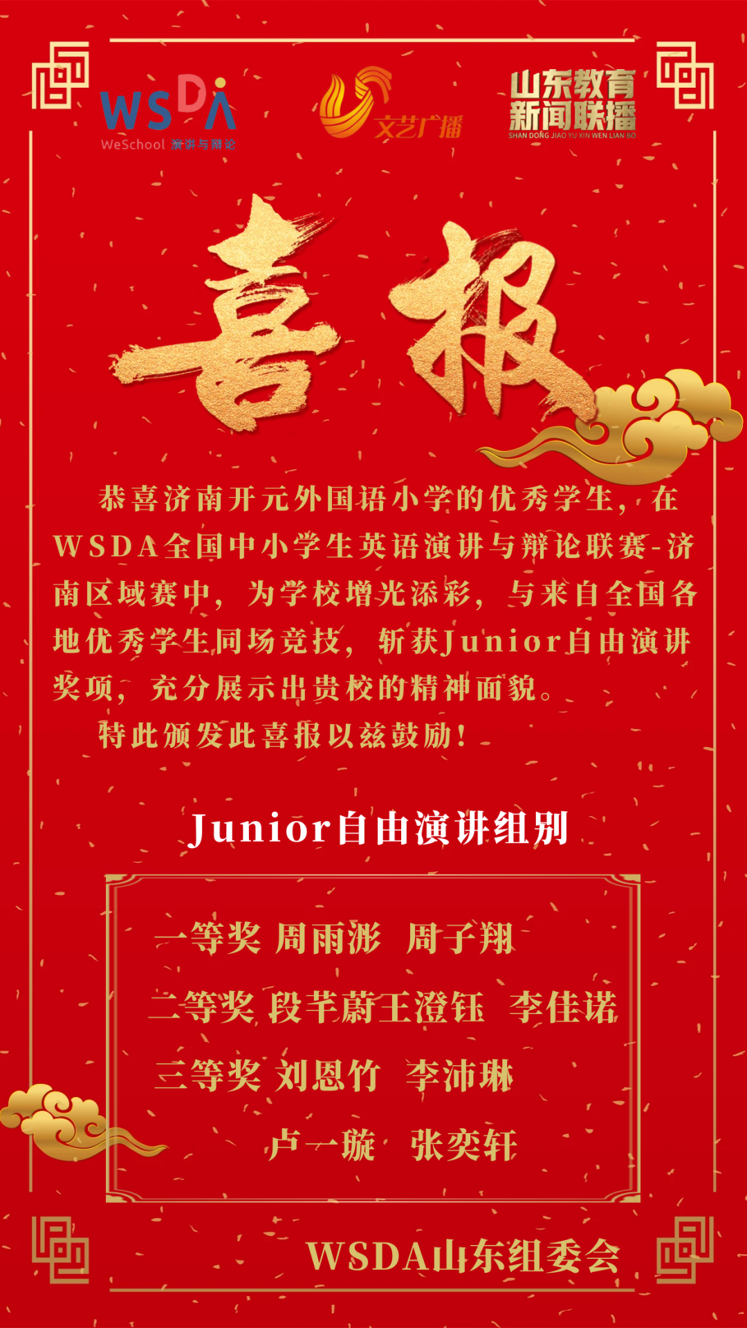 在刚刚落幕的WSDA全国中小学演讲与辩论比赛济南区域赛上,我校参赛学子凭借扎实的语言功底和敏捷的思辨能力勇创佳绩。
