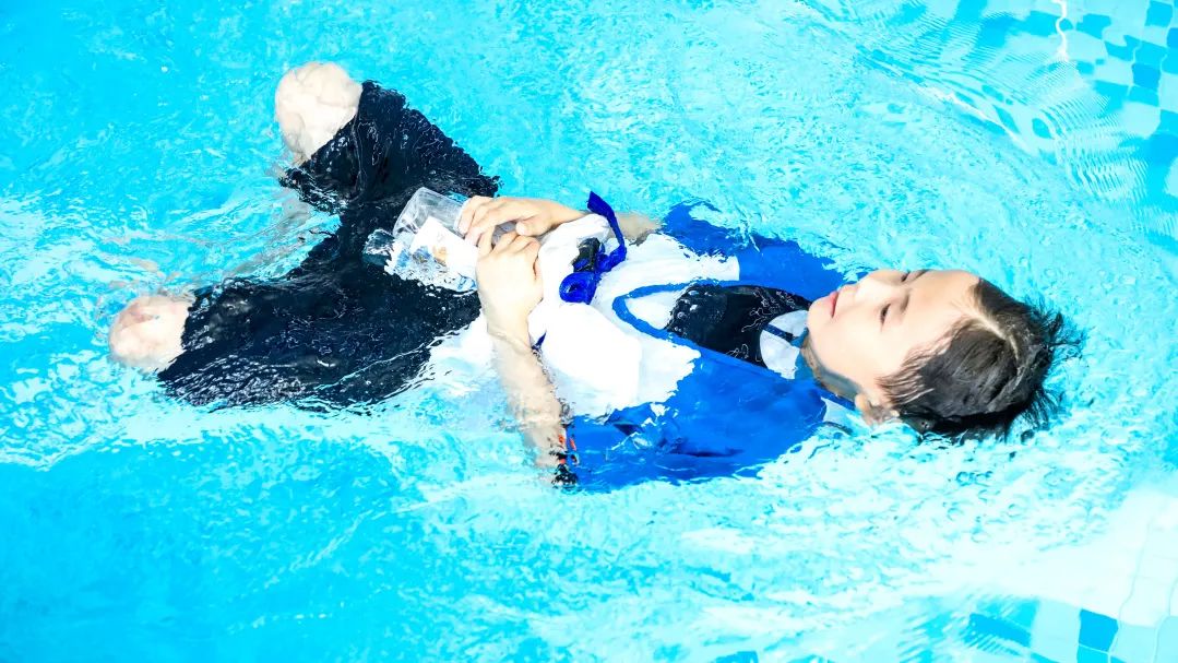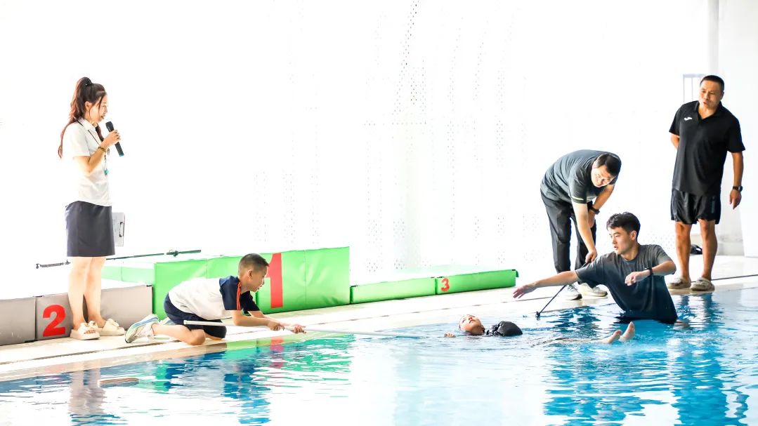 下水前,教导处副主任于春辉变身“安全教官”,不仅总结了游泳学习成果,更重点强调了防溺水安全。他特别指出:安全知识是基础,真实演训才是关键。本次挑战赛就特别设置了硬核环节——重视“水中求生”的理念,让孩子们穿着日常衣物鞋子,模拟落水场景,进行自救互救实战演练。掌握“安全自救,科学他救”的本领,这才是水里畅游最可靠的 “护身符”!